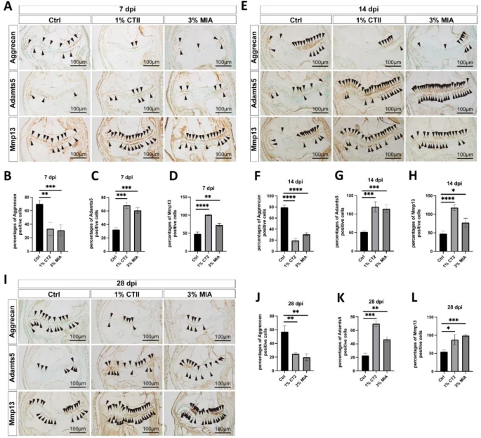 Fig. 5 Aggrecan, Adamts5 and MMP13 expression in zebrafish OA model. (A–D) Immunohistochemical staining and relative quantitative analysis of Aggrecan, Adamts5 and MMP13 at 7 dpi. (E–H) Immunohistochemical staining and relative quantitative analysis of Aggrecan, Adamts5 and MMP13 at 14 dpi. (I–L) Immunohistochemical staining and relative quantitative analysis of Aggrecan, Adamts5 and MMP13 at 28 dpi. *P < 0.05, **P < 0.01, ***P < 0.001, ****P < 0.0001. All data were from n=5 zebrafish in each group..