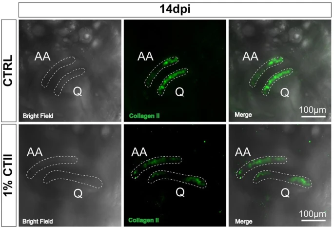 Fig. 6 The expression of Collagen II in living zebrafish following the modeling process. At 14 dpi, there was a significant reduction of Collagen II expression on the surface of the jaw joint cartilage, indicating significant cartilage destruction.