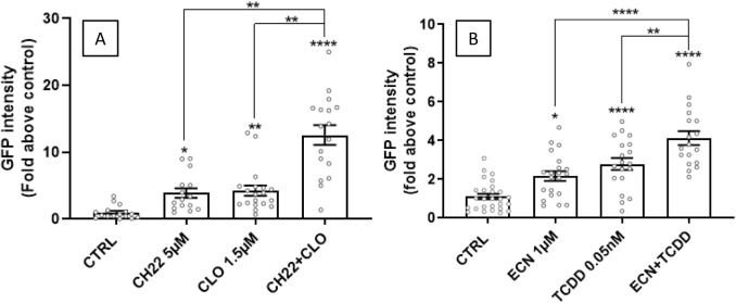 Fig. 4 GFP intensity in tg(cyp3a65:GFP) embryos exposed to zfPXR and zfAhR2 agonist and antagonist ligands alone or in combination (n = 21 embryos minimum per condition) at 120 hpf after 48 h. Exposure to CLO 1.5 µM; TCDD 0.05 nM; CH22 5 µM and ECN 1 µM alone or in combination. Control condition (CTRL) is DMSO 0.02%.