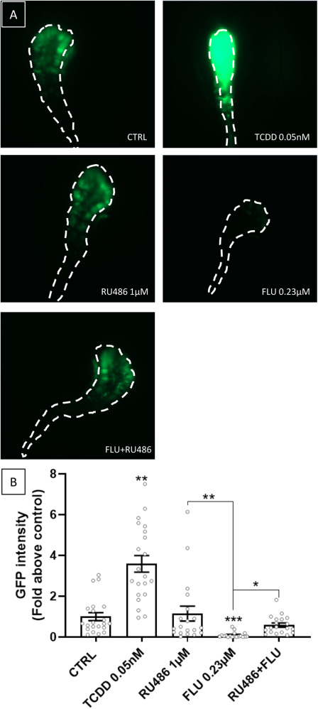 Fig. 6 RU486 reverses inhibited expression of cyp3a65 by fluticasone propionate. (A) In vivo imaging of tg(cyp3a65:GFP) embryos at 120 hpf after 48 h exposure to TCDD 0.05 nM; RU486 1 µM; FLU 0.23 µM and RU486+FLU. TCDD as positive control. Control condition (CTRL) is DMSO 0.02%. The dashed lines delineate the intestine. (B) GFP intensity in individuals (n = 21 embryos minimum per condition) in the same conditions.
