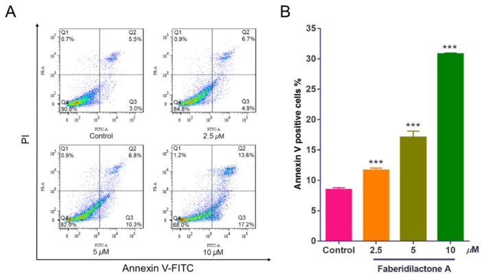 Faberidilactone A induces apoptosis in HepG2 cells. HepG2 cells were treated with different concentrations (2.5, 5, and 10 µM) of faberidilactone A for 48 h, stained with Annexin V-FITC and PI, and then the proportion of apoptotic cells was detected by flow cytometry. (