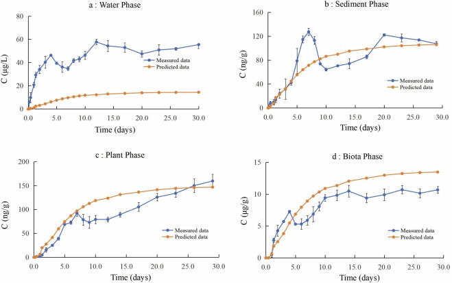 Fig. 2 (a–d) Measured (squares and triangles) vs. predicted (dotted line) concentrations of BPA in the aquatic microcosm as a function of time.