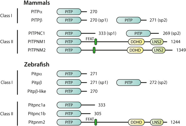 Fig. 1 Classification and domain organisation of PITP proteins found in mammals and zebrafish. PITP proteins are classified as Class I and II. Class I PITPs bind PI and PC whilst Class II PITPs bind PI and PA. The transcriptional variants of PITPβ and PITPNC1 are indicated. In zebrafish, Pitpnc1 is expressed from two separate genes present on different chromosomes.