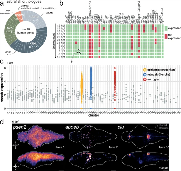 Fig. 1 Most Alzheimer’s risk genes are found in zebrafish and expressed early in development. (a) Of 40 Alzheimer’s risk genes, 17 had one orthologue in zebrafish; 11 had two orthologues; 2 had more than two orthologues; and 10 did not have any annotated orthologue. More details about orthologues of Alzheimer’s risk genes are provided in Supplementary file 1 (source: Ensembl). (b) Expression of Alzheimer’s risk genes during early development in zebrafish. Genes were marked as ‘expressed’ (green) if at least three cells had detectable transcripts in the single-cell RNA-seq dataset from Raj et al., 2020. CABZ01076737.1 is the orthologue of TSPOAP1; cd247l is the orthologue of FCER1G; si:ch211-260p9.3 is an orthologue of PLCG2; zgc:174164 is an orthologue of ADAM10. Other genes have the same name as their human orthologue. The orthologues of MS4A6E were not included. hpf, hours post-fertilisation; dpf, days post-fertilisation.(c) Expression of apoeb in cells of the nervous system at 5 dpf. Each dot represents one cell. Cells are grouped by cluster identity, which are provided in Supplementary file 1. Single-cell RNA-seq data and clustering from Raj et al., 2020. (d) In situ hybridization chain reactions labelling psen2, apoeb, or clu mRNA in the brains of 6-dpf larvae. The images are maximum Z-projections of dorsal (top) and sagittal (bottom) views of three larvae. A, anterior; P, posterior; R, rightwards; L, leftwards; D, dorsal; V, ventral. Larva # labels individual animals across this figure and Figure 1—figure supplements 3 and 4. See also Figure 1—videos 1–9.