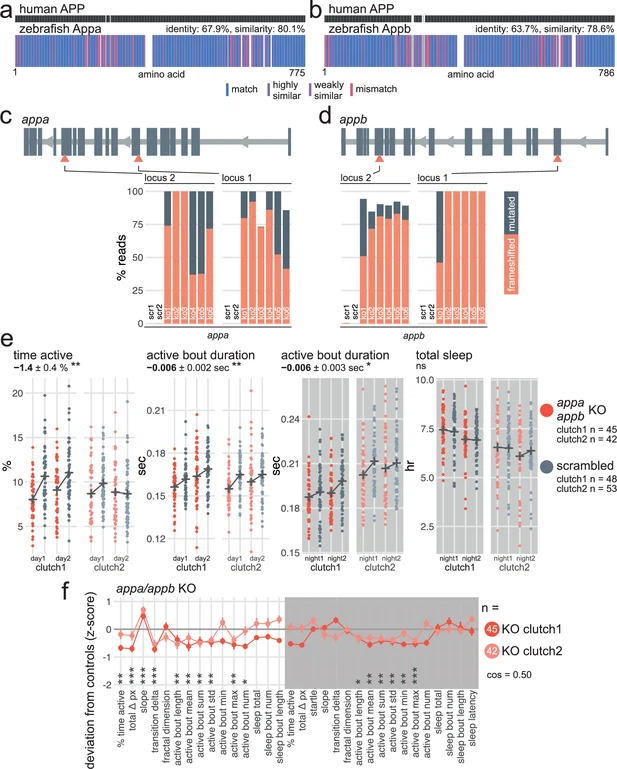 Fig. 3 - Supplemental 4 appa/appb F0 knockouts have subdued swimming bouts throughout the day/night cycle. (a) Human APP amino acid sequence (top) aligned to zebrafish Appa amino acid sequence (bottom). In the zebrafish protein, each amino acid (vertical bar) is coloured based on its similarity with the human protein. White gaps are added when additional residues are present in the other sequence. (b) Human APP amino acid sequence (top) aligned to zebrafish Appb amino acid sequence (bottom), as in (a). (c) (top) Schematic of appa in the 5′–3′ genome direction. Exons are in dark grey; tall exons are protein-coding, small are 5′- or 3′-UTR. Light grey lines are introns, and grey arrows represent the direction of transcription. Orange arrowheads mark the target loci. Exons and introns are on different scales. (bottom) Percentage of reads mutated (height of each bar, with orange representing percentage with a frameshift mutation) at each targeted locus of appa. scr, scrambled-injected control larva; ko, appa F0 knockout larva. Across F0 knockout samples: 96.6 ± 8.4% mutated reads, 70.4 ± 23.2% of all reads had a frameshift mutation. (d) (top) Schematic of appb, as in (c). (bottom) Percentage of reads mutated (height of each bar, with orange representing percentage with a frameshift mutation) at each targeted locus of appb. scr, scrambled-injected control larva; ko, appb F0 knockout larva. Across F0 knockout samples: 95.0 ± 5.6% mutated reads, 82.6 ± 19.0% of all reads had a frameshift mutation. In (c) and (d), the numbers refer to individual animals. For example, ko5 refers to an individual appa/appb double F0 knockout larva for which mutations at the four targeted loci are plotted. (e) Parameter plots for two clutches of appa/appb F0 knockout larvae and scrambled-injected siblings. Each dot represents one larva during one day (left) or night (right). Black crosses mark the group means. Compared to scrambled-injected controls, appa/appb F0 knockouts spent less time active during the day (time active, ** p=0.002) and had shorter swimming bouts across the day/night cycle (active bout duration, day: ** p=0.003; night: * p=0.018). Sleep was not affected (sleep total, ns p=0.71). Statistics by likelihood-ratio test on linear mixed effects models. (f) Behavioural fingerprints of two clutches of appa/appb double F0 knockout larvae. Each dot represents the mean deviation from the same-clutch scrambled-injected mean for that parameter (z-score, mean ± SEM). Asterisks represent the p-values by likelihood-ratio test on linear mixed effects models calculated on the raw parameter values. cos, cosine similarity between the two clutch fingerprints.