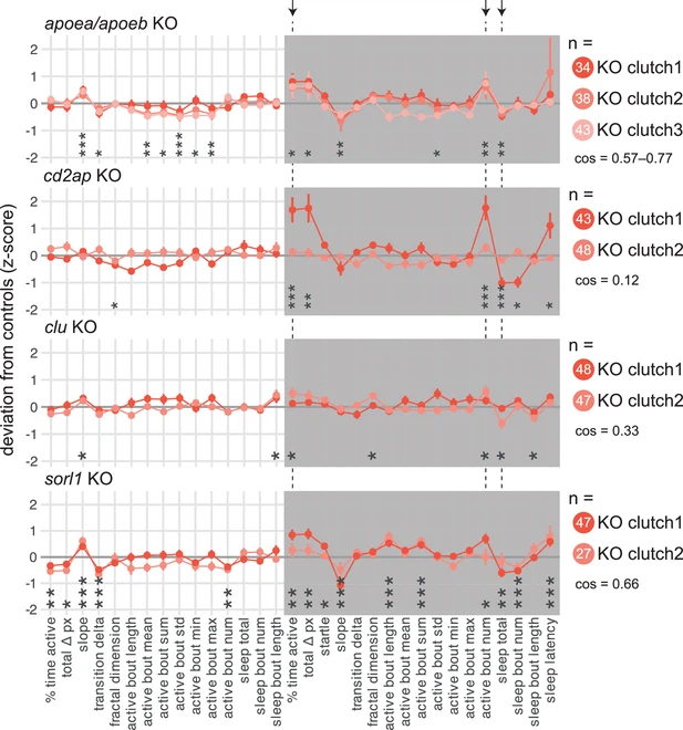 Fig. 4 F0 knockout larvae in genes associated with late-onset Alzheimer’s disease sleep less at night. For each gene: behavioural fingerprints of N = 2–3 clutches of F0 knockout larvae. Each dot represents the mean deviation from the same-clutch scrambled-injected mean for that parameter (z-score, mean ± SEM). Asterisks represent the p-values by likelihood-ratio test on linear mixed effects models calculated on the raw parameter values. cos, cosine similarities between fingerprints. Arrows and dashed lines mark the three parameters which are significant for all four late-onset Alzheimer’s risk genes tested.