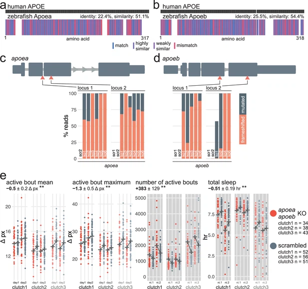 Fig. 4 - Supplemental 1 apoea/apoeb double F0 knockouts have subdued swimming bouts during the day and sleep less at night. (a) Human APOE amino acid sequence (top) aligned to zebrafish Apoea amino acid sequence (bottom). In the zebrafish protein, each amino acid (vertical bar) is coloured based on its similarity with the human protein. White gaps are added when additional residues are present in the other sequence. (b) Human APOE amino acid sequence (top) aligned to zebrafish Apoeb amino acid sequence (bottom), as in (a). (c) (top) Schematic of apoea in the 5′–3′ genome direction. Exons are in dark grey; tall exons are protein-coding, small are 5′- or 3′-UTR. Light grey lines are introns, and grey arrows represent the direction of transcription. Orange arrowheads mark the target loci. Exons and introns are on different scales. (bottom) Percentage of reads mutated (height of each bar, with orange representing percentage with a frameshift mutation) at each targeted locus of apoea. scr, scrambled-injected control larva; ko, apoea F0 knockout larva. Across F0 knockout samples: 99.6 ± 1.2% mutated reads, 77.5 ± 17.8% of all reads had a frameshift mutation. (d) (top) Schematic of apoeb, as in (c). (bottom) Percentage of reads mutated (height of each bar, with orange representing percentage with a frameshift mutation) at each targeted locus of apoeb. scr, scrambled-injected control larva; ko, apoeb F0 knockout larva. Across F0 knockout samples: 95.2 ± 14.2% mutated reads, 64.6 ± 39.9% of all reads had a frameshift mutation. In (c) and (d), the numbers refer to individual animals. For example, ko6 refers to an individual apoea/apoeb double F0 knockout larva for which mutations at the four targeted loci are plotted. (e) Parameter plots for three clutches of apoea/apoeb double F0 knockout larvae and scrambled-injected siblings. Each dot represents one larva during one day (left) or night (right). Black crosses mark the group means. (left) During the day, apoea/apoeb double F0 knockout larvae had more subdued swimming bouts than scrambled-injected siblings (active bout mean, ** p=0.006; active bout maximum, ** p=0.004). (right) At night, apoea/apoeb double F0 knockout larvae were performing more swimming bouts (number of active bouts, ** p=0.003) and sleeping less (total sleep, ** p=0.009) than scrambled-injected siblings. Six datapoints from four apoea/apoeb F0 knockout larvae fall outside the Y axis limit of the number of active bouts (7229–13,975 bouts). Statistics by likelihood-ratio test on linear mixed effects models. ni., night.
