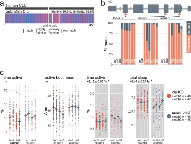 Fig. 4 - Supplemental 3 clu F0 knockouts sleep slightly less at night. (a) Human CLU amino acid sequence (top) aligned to zebrafish Clu amino acid sequence (bottom). In the zebrafish protein, each amino acid (vertical bar) is coloured based on its similarity with the human protein. White gaps are added when additional residues are present in the other sequence. (b) (top) Schematic of clu in the 5′–3′ genome direction. Exons are in dark grey; tall exons are protein-coding, small are 5′- or 3′-UTR. Light grey lines are introns, and grey arrows represent the direction of transcription. Orange arrowheads mark the target loci. Exons and introns are on different scales. (bottom) Percentage of reads mutated (height of each bar, with orange representing percentage with a frameshift mutation) at each targeted locus of clu. scr, scrambled-injected control larva; ko, clu F0 knockout larva. The numbers refer to individual animals. For example, ko2 refers to an individual clu F0 knockout larva for which mutations at each targeted locus are plotted. Across F0 knockout samples: 99.6 ± 1.6% mutated reads, 84.9 ± 17.7% of all reads had a frameshift mutation. (c) Parameter plots for two clutches of clu F0 knockout larvae and scrambled-injected siblings. Each dot represents one larva during one day (left) or night (right). Black crosses mark the group means. Loss of Clu did not consistently affect locomotor activity during the day (time active, ns p=0.18; active bout mean, ns p=0.21). At night, clu F0 knockouts were slightly more active (time active, * p=0.047) and slept less (total sleep, * p=0.033) than scrambled-injected siblings, although the effect sizes were not well replicated across clutches. One datapoint from a clu F0 knockout larvae (clutch2) falls outside the Y axis limit of the night time active plot (3.3%).