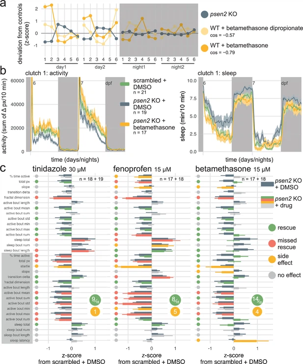 Fig. 6 Betamethasone normalises the psen2 knockout behavioural phenotype. (a) The psen2 F0 knockout fingerprint was used as query to identify small molecules that generate the opposite behavioural phenotype when applied on wild-type larvae, returning betamethasone as candidate therapeutic. Plotted are the query psen2 fingerprint (mean of two clutches, dark grey) and the two betamethasone fingerprints from the drug database with the largest negative cosine similarities (yellow). Parameters: 1, average activity (sec active/min); 2, average waking activity (sec active/min, excluding inactive minutes); 3, total sleep (hr); 4, number of sleep bouts; 5, sleep bout length (min); 6, sleep latency (min until first sleep bout). cos, cosine similarity between each betamethasone fingerprint and the psen2 F0 knockout fingerprint. (b) (left) Activity (sum of Δ pixels/10 min) of scrambled-injected larvae treated with DMSO and psen2 F0 knockout larvae treated with DMSO or 15 µM betamethasone during 48 hr on a 14 hr:10 hr light:dark cycle (white background for days, dark grey background for nights). (right) Sleep (minutes per 10 min epoch) during the same experiment. Traces are mean ± SEM across larvae. See also Figure 6—figure supplement 1 for results from replicate clutch 2. (c) Survey of behavioural parameters for each drug treatment. Bars represent the mean deviation from scrambled-injected siblings treated with DMSO (z-score, mean ± SEM). Dark grey bars represent the psen2 knockouts treated with DMSO, i.e. the phenotype to be treated (same population of psen2 knockouts treated with DMSO for all the drug treatments, n=19+18). Other bars are colour-coded by the effect of each drug on psen2 knockouts: ‘rescue’ (green) if the drug normalised the parameter; ‘missed rescue’ (red) if the drug failed to normalise the parameter; ‘side effect’ (yellow) if the drug significantly altered a parameter which was unaffected in psen2 knockouts; and ‘no effect’ (grey). Calls were decided based on significance by likelihood-ratio test on linear mixed effects models calculated on the raw parameter values from both clutches (n is sample size of drug-treated psen2 knockouts of clutch1 + clutch2).