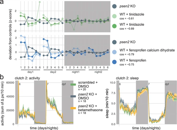 Fig. 6 - Supplemental 1 Selection of candidate therapeutics to normalise the psen2 behavioural phenotype by predictive behavioural pharmacology. (a) The psen2 F0 knockout fingerprint was used as query to identify small molecules that generate the opposite behavioural phenotype when applied on wild-type larvae, returning tinidazole and fenoprofen as candidate therapeutics. Plotted are the query psen2 fingerprint (mean of two clutches, dark grey) and the tinidazole (green) and fenoprofen (blue) fingerprints from the drug database. Parameters: 1, average activity (sec active/min); 2, average waking activity (sec active/min, excluding inactive minutes); 3, total sleep (hr); 4, number of sleep bouts; 5, sleep bout length (min); 6, sleep latency (min until first sleep bout). cos, cosine similarity between the drug fingerprint and the psen2 F0 knockout fingerprint. (b) (left) Activity (sum of Δ pixels/10 min) of scrambled-injected larvae treated with DMSO and psen2 F0 knockout larvae treated with DMSO or 15 µM betamethasone during 48 hr on a 14 hr:10 hr light:dark cycle (white background for days, dark grey background for nights). (right) Sleep (minutes per 10-min epoch) during the same experiment. Traces are mean ± SEM across larvae.
