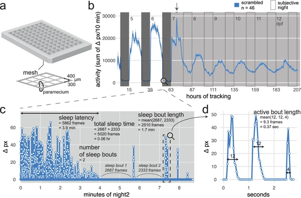 Fig. 2 Analysis of zebrafish sleep/wake behaviour at the frame-by-frame resolution with the FramebyFrame R package. (a) 3D model of the 96-square well mesh-bottom plate. Available at github.com/francoiskroll/FramebyFrame (copy archived at Kroll, 2025a). (b) Example of an 8-day (208 hr total) video-tracking experiment. scrambled-injected control larvae were in a mesh-bottom plate placed in a water bath containing paramecia. Larvae were tracked for 63 hr on a 14 hr:10 hr light:dark cycle (white and dark grey backgrounds, respectively), then switched to constant dim light (30 lux) for 145 hr (subjective nights are framed). The larvae were tracked from 4 to 13 dpf and all appeared healthy at the end of the experiment. The trace is the mean ± SEM across larvae of the activity (sum of Δ pixels/10 min). The arrow indicates when the water in the bath was replaced and fresh paramecia were supplemented, causing a spike in activity. (c) The FramebyFrame R package calculates 17 parameters from the Δ pixel timeseries of each larva. The parameters are grouped in three categories: activity parameters, active bout parameters, and sleep parameters. Here, sleep parameters calculated by the FramebyFrame R package are annotated on the first ~9 min of the Δ pixel timeseries for one wild-type larva starting at lights off. These parameters describe the sleep behaviour of each larva during each day or night. Sleep parameters are also calculated for days, except for sleep latency. This plot is connected to (b) for illustrative purposes only; the data was not from the same experiment. (d) Example of an active bout parameter—active bout length—annotated on the sample data from (c). For all the activity and active bout parameters calculated by the FramebyFrame R package, see Figure 2—figure supplement 1.