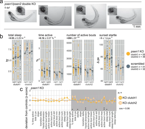 Fig. 3 - Supplemental 1 psen1 F0 knockouts are slightly hyperactive at night. (a) Pictures of psen1/psen2 double F0 knockout larvae (5 dpf). Note patchy retinal pigment epithelium and eye oedema (insets). (b) Parameter plots for two clutches of psen1 F0 knockout larvae and scrambled-injected siblings. Each dot represents one larva during one night. Black crosses mark the group means. At night, psen1 F0 knockouts slept less (total sleep, * p=0.030), spent more time active (time active, * p=0.018), and initiated more swimming bouts (number of active bouts, ** p=0.004) than scrambled-injected siblings. The startle response of psen1 F0 knockouts was also slightly suppressed (sunset startle, * p=0.015). Statistics by likelihood-ratio test on linear mixed effects models. (c) Behavioural fingerprints of two clutches of psen1 F0 knockout larvae. Each dot represents the mean deviation from the same-clutch scrambled-injected mean for that parameter (z-score, mean ± SEM). Asterisks represent the p-values by likelihood-ratio test on linear mixed effects models calculated on the raw parameter values, as in (b). cos, cosine similarity between the two clutch fingerprints.