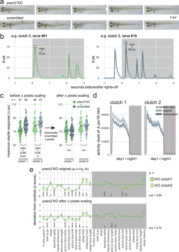 Fig. 3 - Supplemental 3 The behavioural phenotype of psen2 F0 knockouts is not an artefact caused by their fainter pigmentation. (a) Pictures of psen2 F0 knockout larvae (top row) and scrambled-injected control larvae (bottom row) at the end of the behavioural tracking (8 dpf). Note the fainter pigmentation of psen2 F0 knockout larvae, particularly over the swim bladder (marked by black arrowheads). (b) Frame-by-frame Δ pixel timeseries of two individual larvae showing the startle response shortly after the lights turn off. (left) Startle response of a psen2 F0 knockout larva. During the 3 s after lights-off, the most vigorous bout reached a maximum Δ pixel value of 75 px. (right) Startle response of a scrambled-injected larva. During the 3 s after lights-off, the most vigorous bout reached a maximum Δ pixel value of 85 px. (c) Maximum startle responses over the three consecutive lights-off transitions, by clutch (clutch 1 and clutch 2) and group (psen2 KO or scrambled). Each dot represents one larva. The startle response was defined as the maximum Δ pixel during the 3 s directly after lights-off (see b). There were three lights-off transitions during the experiment; plotted for each larva is the largest of the three startle responses (maximum startle response). (left) Unprocessed data. scrambled-injected larvae displaced more pixels during the startle response at lights-off compared to psen2 F0 knockout larvae, presumably because they appeared darker to the camera (clutch 1: * p=0.042; clutch 2: *** p<0.001, by Welch’s t-test). The ratio of the means estimated how much darker psen2 knockout larvae were compared to scrambled-injected larvae; that is, psen2 knockout larvae were 0.89 and 0.95× as dark as scrambled-injected larvae. (right) The ratios were then used to downscale the frame-by-frame Δ pixel data of the scrambled-injected larvae, in a sense artificially making them as faint as psen2 knockout larvae. As intended, the downscaling rendered the differences in startle response non-significant (clutch 1: ns p=0.78; clutch 2: ns p=0.77, by Welch’s t-test). (d) The original activity trace (sum Δ pixels/10 min, mean ± SEM) of scrambled-injected larvae (lighter grey) compared to the downscaled one (darker grey), during the first day and night as illustration. The data of psen2 F0 knockouts is not shown as it is not modified during the downscaling. (e) Behavioural fingerprints of two clutches of psen2 F0 knockout larvae, before and after downscaling the Δ pixel data of the scrambled-injected larvae. Each dot represents the mean deviation from the same-clutch scrambled-injected mean for that parameter (z-score, mean ± SEM). Two parameters were excluded from the fingerprints: sunset startle, as the difference between knockouts and controls was artificially nullified by the pixel scaling procedure; and active bout minimum, because the pixel scaling procedure artefactually raised this parameter for scrambled-injected larvae. Asterisks represent the p-values by likelihood-ratio test on linear mixed effects models calculated on the raw parameter values. cos, cosine similarity between the two clutch fingerprints. The pixel scaling procedure is available as a function (pixelAdjust(…)) in the FramebyFrame R package.