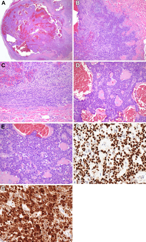 Fig. 4 Histopathologic features of case 4. (A) This tumor also presented as a deep-dermal, somewhat circumscribed lesion with areas of peripheral infiltration (B). (C) At the periphery, the cells often lined up in a single file pattern. (D) Pseudocyst-like spaces with proteinaceous secretions were noted as well as several mitotic figures (E). (F) SOX10 and (G) S100 stains are diffusely positive.
