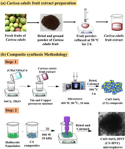 Fig. 1 Figure 1. (a) Preparation of C. edulis fruit extract. (b) Schematic representation of the synthesis of the CuO/SnO2/HNT composite using C. edulis fruit extract.