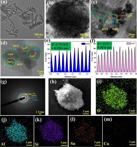 Fig. 2 Figure 2. TEM images of (a) pristine HNT, (b) the 20CS-HNT composite (at 200 nm), and (c) the 20CS-HNT composite (at 20 nm). (d) HR-TEM image of the 20CS-HNT composite (at 5 nm). d spacing values of (e) SnO2 and (f) CuO. (g) SAED pattern of the 20CS-HNT composite. Elemental mapping images of the 20CS-HNT composite: (h) overall image, (i) oxygen, (j) aluminum, (k) silicon, (l) tin, and (m) copper.