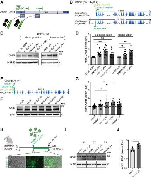 Fig. 1 SINEUP-CHD8/Chd8 stimulates protein production in human hiNPCs and mouse primary neuronal cells (A) Schematic representation of SINEUP modular structure and its localization on CHD8 target transcript. BD, binding domain, overlapping in antisense orientation with the target mRNA; ED, effector domain, recruiting the target mRNA to polysomes to induce its translation. Two different SINEUP molecules have been designed which target either the translational initiation site (1st AUG, 1st Met) or one AUG in the CDS (int AUG). (B) Schematic representation of SINEUP-CHD8 (SINEUP_001/006, SINEUP_002, SINEUP_003/007) showing their location within CHD8 human isoforms, short GenBank: NM_020920 and long GenBank: NM_001170629, respectively. SINEUP_001 and _006 target the translational initiation site (1st AUG) of the long isoform, SINEUP_002 targets the 1st AUG of the short isoform, while SINEUP_003 and _007 recognize one in-frame AUG (Int AUG), which is common to both isoforms. (C) Representative western blots (WBs) for SINEUP_CHD8 delivery via electroporation or lentiviral transduction to a hiNPC CHD8 knockdown model obtained by Sh-driven CHD8 suppression (Sh4-CHD8) from Sugathan et al.14 Sh4-CHD8 cells were electroporated (left) or transduced (right) with lentiviral vectors expressing SINEUP control (pDUAL EGFP or pAIB-Empty) or the different SINEUP molecules targeting CHD8 (SINEUP_001, SINEUP_003, or the SINEUP_001 + 003 administered together). (D) Quantification of CHD8 protein levels from WB experiments (C) normalized on HSP90 and the respective control. HSP90 loading control—although smaller in size compared with CHD8 protein—carefully mirrors CHD8 protein levels in WB experiments, at high and low exposure, showing comparable correlation between the quantity of lysate and the chemiluminescence intensity with R2 coefficients above 0.95. (E) Schematic representation of SINEUP-Chd8 (SINEUP_01/02, SINEUP_03, and SINEUP_05) showing their target location within the Chd8 mouse ortholog (GenBank: NM_201637.3). (F) Representative WBs for SINUEP-Chd8 delivery via transfection to P19 cells. P19 cells were transfected with either SINEUP control vector (empty) or different SINEUPs targeting Chd8 (SINEUP_01, SINEUP_02, SINEUP_03, or SINEUP_05). (G) Quantification of Chd8 protein levels from WB experiments (F) normalized on β-actin and the empty control. (H) Primary cortical neuronal culture experimental setup from wild-type embryonic day 18.5 (E18.5) embryos (top) and representative images of neuronal cultures at 13 days in vitro (DIV) after AAV9 viral transduction with SINEUP_03 (bottom). (I) Western blots for SINEUP_03 delivery via viral transduction to primary cortical neurons. Primary neurons were transduced with SINEUP control vector (empty) or SINEUP_03 targeting Chd8. (J) Quantification of Chd8 protein levels from WB experiments, data normalized on Hsp90 (I). Data are presented as scatter dot blot, mean ± SEM with one-way ANOVA (parametric data) (G), or Kruskal-Wallis (non-parametric data) (D) significance testing followed by post-hoc tests for multiple testing correction; two-sided t-test in (J); significance levels: ∗∗∗∗p ≤ 0.0001, ∗∗∗p ≤ 0.001, ∗∗p ≤ 0.01, ∗p < 0.05; ns, not significant. Scale bar, 50 μm (H).