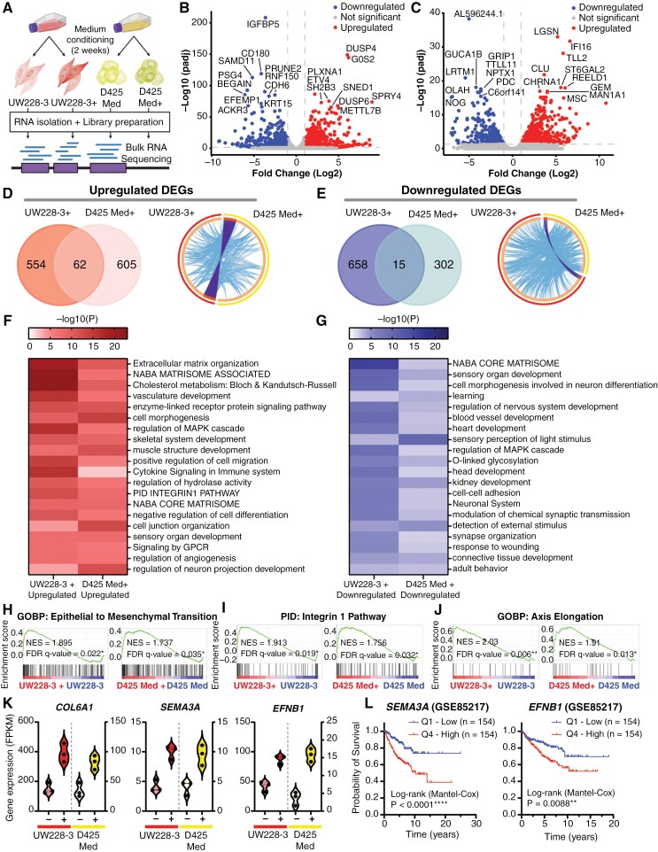 Fig. 5 Transcriptomic analysis reveals upregulation of genes associated with cancer stemness and migration. (A) Schematic overview of the bulk RNA sequencing protocol. (B) Volcano plot showing all differentially expressed genes (DEGs) upon comparison of the transcriptome of UW228-3 with UW228-3 in complete neural stem cell medium (+), or (C) D425 Med with D425 Med cultured in complete neural stem cell medium (+). Gene names of the top 20 most significant DEGs are shown. Significant DEGs are those with a fold change of ≥ 2 (Log2FC ≥ 1) and an adjusted P-value of ≤ .05. Blue dots (left side) represent downregulated genes and red dots (right side) represent upregulated genes. (D) Left panel: Venn diagram showing overlap between the upregulated and (E) downregulated DEGs in UW228-3+ and D425 Med+. Right panel: Circos plots displaying the gene overlap and shared term level between the gene lists UW228-3 versus UW228-3+ and D425 Med versus D425 Med+. Purple lines link identical genes and blue lines link genes that belong to the same enriched ontology term. The inner circle represents the 2 gene lists, whereas the outside circle represents the group. (F, G) Heatmaps of enriched gene set terms shared across both gene lists, colored by P-values. Each term represents a cluster of multiple associated gene sets. Clusters were named after the most significantly expressed gene set present in both gene lists. (H–J) Epithelial to mesenchymal transition, integrin-1 pathway, and axis elongation are all significantly enriched in both UW228-3 and D425 Med when cultured in complete neural stem cell medium (+) as observed upon GSEA analysis. (K) Violin plots showing the DEGs COL6A1, SEMA3A, and EFNB1 that are significantly enriched in both UW228-3+ and D425 Med+, expressed as fragments per kilobase (FPKM). (L) Kaplan–Meier curves represent the survival of MB patients with low expression (Q1) compared with MB patients with high expression (Q4) of SEMA3A or EFNB1.