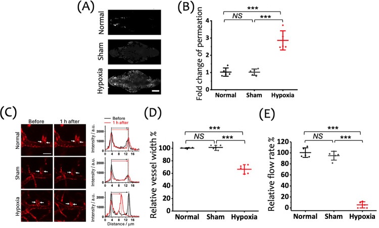 Fig. 2 Effects of a 15 min hypoxic insult on BBB integrity, vasculature structure, and cerebral blood flow in zebrafish larvae, assessed 1 h postinsult. (A) Representative images of the cranial region showing the extravascular accumulation of fluorescent tracers (gray: RITC-dextran, MW: 10 k), 1 h posthypoxia following vascular injection, indicating BBB disruption in the Hypoxia group. Scale bar: 100 μm. (B) Fold change in tracer permeation, highlighting a significant increase in BBB permeability in the Hypoxia group compared to the Normal and Sham groups. (C) Left: Representative images of cerebral vasculature (red: mCherry) in zebrafish larvae before and 1 h after the 15 min hypoxic insult. White arrows indicate the proximal region of the first branch of the central artery (CtA1st), where vessel width measurements were taken. Scale bar: 20 μm. Right: Cross-sectional fluorescence intensity profiles showing vessel width changes pre- and posthypoxia. (D) Quantification of the relative vessel width in the CtA1st across the Normal, Sham, and Hypoxia groups, showing a significant reduction in the Hypoxia group. (E) Relative flow rate in the CtA1st, demonstrating a significant reduction in the Hypoxia group compared to the Normal and Sham groups. Data are shown as mean ± SD with individual data points (n = 5 larvae per group) in panels (B), (D), and (E).