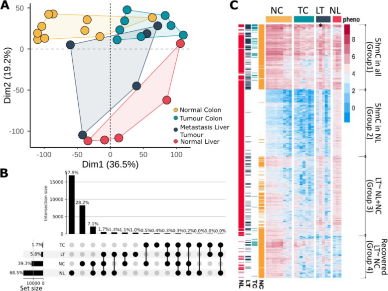 5hmC profiles in liver metastasis and colon are similar. Colour scheme: yellow normal colon tissue from CRC patients (NC); light blue primary tumour in colon (TC); dark blue metastasised to liver tumours (LT); red normal liver (NL).
