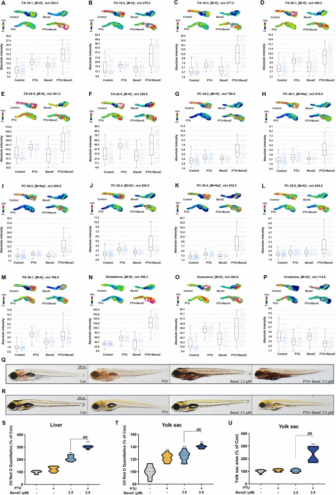 Fig. 3 Effect of PTU combined with BavaC on endogenous metabolites and oil red O staining in zebrafish: (A-P): MALDI-MS images and metabolite expression level statistics. (Q): Oil red O staining; the red line indicates the liver, and the white line indicates the yolk sac. (R): Bright field images of zebrafish; the white line indicates the yolk sac. (S): Quantitative statistics of the oil red O staining results for the liver (n = 10). (T): Quantitative statistics of the oil red O staining results for the yolk sac (n = 10). (U): Statistics of the yolk sac area (n = 15). * *p < 0.01 vs. Con, ##p < 0.01 vs. BavaC 2.5 μM. FA: fatty acids; PC: phosphatidylcholine; PS: phosphatidylserine.