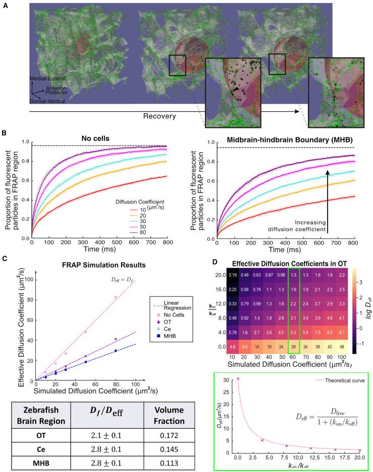 Fig. 2 In silico FRAP simulations. (A) Example outputs of simulated FRAP measurements in the OT of the zebrafish brain, represented by the white translucent skeleton. Green and black dots represent discrete fluorescent and photobleached molecules, respectively. Red sphere represents photobleached region of radius 6 μm. The second and third panels are zoomed in by a factor of two compared to left hand panel, to better visualize the FRAP region during recovery. The insets show a close-up of particles diffusing in a tortuous environment, showing the distribution of bleached and fluorescent particles before and after recovery. (B) Recovery curves for molecules with input μm2/s for simulations without cells and midbrain-hindbrain boundary environments (solid lines and shaded regions represent the mean and standard deviations of simulated experiments, respectively). The curves are generated from 10 experiments consisting of simulating 20,000 independent particles in parallel. Each simulation is fitted with Soumpasis diffusion (Eq. (5)) (dashed lines) to obtain average diffusion time constant, . Black horizontal dashed lines represent the maximum intensity, the recovery curve will converge to since the system is conserved. (C) Results of the measured effective diffusion coefficients, , for different regions in the zebrafish brain obtained from recovery curves such as in (B). The table shows the average factor decrease in effective diffusion coefficient, which is the reciprocal of the gradients of the fitted dashed lines. Volume fraction indicates the proportion of the ECS volume to the volume of the full tissue segment. (D) Heatmap of the effects of transient binding. Values indicate the measured using the same technique, for different values of and input diffusion coefficient . The Color of the heatmap is on log scale. Lower panel shows as a function of , with simulation results (crosses) and theoretical curve (solid line).