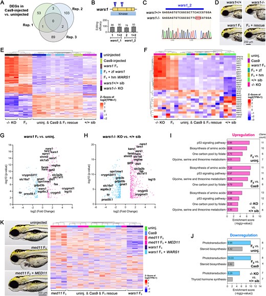 Fig. 5 Comprehensive transcriptomic analysis of uninjected and Cas9-injected control, F0, stable knockout, and rescued animals. (A) A Venn diagram compares DEGs in Cas9-injected versus uninjected embryos at 3 dpf. Three replicates indicate three independent runs of RNA-sequencing (RNA-seq), with each replicate containing biological triplicates (n = 6 embryos for each biological replicate). (B) Schematics of two gRNA target loci (blue triangle) and exons encoding kinase domain (yellow boxes) for the wars1 gene. The editing efficiency for each gRNA, injected either individually or in combination, is shown below. (C) Sequence alignment and chromatogram showing a 4bp deletion in the wars1 stable mutant generated by the wars1_2 gRNA, as revealed by Sanger sequencing. (D) Representative images of morphology for wars1 WT sibling (wars1+/+), homozygous knockout (wars1-/-), F0 and F0 rescued with human WARS1 mRNA embryos at 3dpf. Lateral view and anterior to the left. (E) A heatmap visualization of DEGs in uninjected (uninj.), Cas9 protein-injected (Cas9), wars1 F0, F0 rescued with zebrafish wars1 mRNA (F0 + zf), F0 rescued with human WARS1 mRNA (F0 + hm), wars1 WT sibling (+/+ sib) and homozygous knockout (-/- KO) animals from RNA-seq data. The genes used for heatmap visualization were a set of DEGs in the F0 versus uninjected group. (F) Another heatmap visualizes genes involved in aminoacyl-tRNA biosynthesis. (G and H) Volcano plots for wars1 F0 versus uninjected control and wars1-/- versus wars1+/+ sibling animals. Overlapped top DEGs are revealed on the figure. (I and J) KEGG pathway analysis shows DEGs enrichment in three groups (wars1 F0 versus uninjected, F0 versus Cas9, and wars1-/- versus wars1+/+ sibling) and is further divided into upregulation (I) and downregulation (J) groups. (K) Representative images of morphology for uninjected, med11 F0 and F0 rescued with human MED11 mRNA at 4 dpf are shown at the left panel. The heatmap at the right panel visualizes 1000 DEGs of uninjected, Cas9-injected, med11 F0, med11 F0 rescued with human MED11 mRNA, wars1 F0 and wars1 F0 rescued with human WARS1 mRNA animals at 3 dpf. Each group contains biological triplicates with six animals in each replicate. Note that one outlier in Cas9 group was removed in (E–J), and another in F0 + WARS1 group was removed in (K). For (A, E-K), the threshold cutoff was set to two-fold change (log2 fold change ≥ ±1) and a P-value less than 0.01.