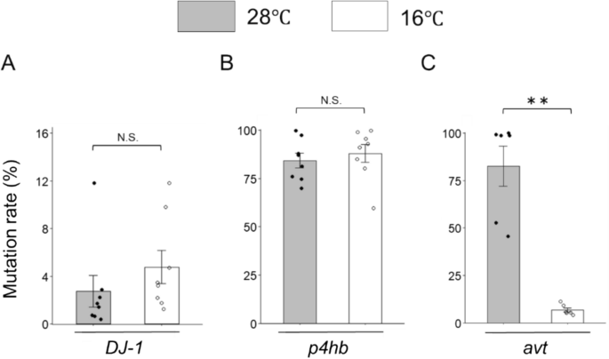 Fig. 1 The effect of low-temperature incubation on the on-target mutation rate. After the introduction of RGEN, embryos were cultured at 28 °C or 16 °C until Stage 25. Amplicon sequencing was performed for each region, and the mutation rate was calculated. A DJ-1 (n = 8) B p4hb (n = 8) C avt (n = 6). While no significant difference in mutation rate was observed between temperatures for DJ-1 and p4hb, the mutation rate for avt was significantly reduced at 16 °C compared to 28 °C. N.S.: no significant difference, **: p < 0.01, Columns and error bars represent mean ± SE