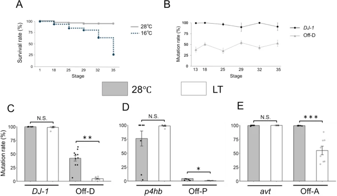 Fig. 3 Low-temperature treatment (LT) during the early stages of embryonic development reduces off-target mutagenesis without decreasing on-target mutagenesis in medaka. A To investigate the effect of low-temperature conditions on embryo survival, embryos were cultured at 28 °C (126 eggs) and 16 °C (115 eggs). The survival rate at 16 °C dramatically decreased as development progressed. B Temporal changes in on-target and off-target mutation rates were examined. Those of DJ-1 (on-target) and Off-D (off-target) were calculated at each developmental stage (n = 10). While DJ-1 reached nearly 100% mutation rate by Stage 13, Off-D showed no clear upward trend in mutation rate beyond Stage 13. Each data point represents mean ± SE. C, D, E The effect of LT on On-Target and Off-Target mutation rates. (C)DJ-1 and Off-D (n = 8–10) (B) p4hb and Off-P (n = 9) (C) avt and Off-A (n = 8) The 28 °C group was cultured at 28 °C until hatching, while the LT group was cultured at 16 °C until Stage 13, then shifted to 28 °C until hatching. No significant difference in mutation rates was observed in the on-target regions between the LT and 28 °C groups. However, for off-target regions, LT significantly reduced them compared to 28 °C. N.S.: no significant difference, *: p < 0.05, **: p < 0.01, ***: p < 0.001. Columns and error bars represent mean ± SE