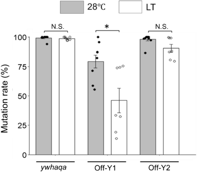 Fig. 4 The effect of early low-temperature treatment (LT) on on-target and off-target mutation rates in zebrafish. The 28 °C group was cultured at 28 °C until hatching, while the LT group was cultured at 22 °C for 1 day, then shifted to 28 °C until hatching. No significant difference in mutation rate was observed between the 28 °C and LT groups for ywhaqa (n = 7–10). However, for Off-Y1, LT significantly reduced the mutation rate compared to 28 °C (n = 7–10). For Off-Y2, although the difference was not statistically significant, the mutation rate tended to be lower in the LT group(n = 7–10). N.S.: no significant difference, *: p < 0.05. Columns and error bars represent mean ± SE