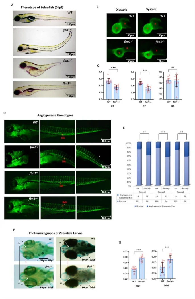 Fig. 4 Phenotypic Spectrum of F2 fbn1+/− Zebrafish larvae. F2 fbn1+/− Zebrafish were phenotyped with light microscopy in the zebrafish representative images are shown. Number of animals = 743, N = 3. Data were compared using an independent two-sample t-test, and the P-values were calculated to assess the significance of the difference in means between the two groups. Values of *P ≤ 0.05 were considered significant. (A) Comparison of the morphology between F2 fbn1+/− and WT zebrafish larvae at 72 hpf in the brightfield. WT zebrafish shows minimal pericardial effusion and no tail defects; A moderately affected morphant with a small amount of pericardial effusion, protruding mouth, and a curly tail; A severely affected morphant with a large pericardial effusion, protruding mouth, and severe tail curvature. The white arrow in the figure refers to the aortic arches bleeding (B) Comparison of the heart between F2 fbn1+/− and WT zebrafish larvae at 72 hpf. (C) Comparison of the cardiac function between F2 fbn1+/− and WT zebrafish larvae at 72 hpf. F2 fbn1+/− zebrafish appear significant defects in ejection fraction and fraction shorting. (D) F2 fbn1+/− Zebrafish larvae show angiogenesis abnormalities phenotype. WT zebrafish phenotype (120 hpf). F2 fbn1+/− Zebrafish shows the blood vessels are not cavitated. Some F2 fbn1+/− Zebrafish shows the increased dorsal aorta diameter phenotype and intersegmental vascular disorders. (E) Incidence of angiogenesis abnormalities in F2 fbn1+/− Zebrafish larvae at 120 hpf. hpf: hours post-fertilization; FS: fraction shorting; EF: ejection fraction. (F). Photomicrographs of 144 and 168 hpf zebrafish larvae at the ventral view. All cartilage and bones appear normally shaped and developed in WT zebrafish. F2 fbn1+/− zebrafish exhibits bigger Meckel’s cartilage and the increased distance from Meckel’s cartilage to the ceratohyal increased. (G). The ratio of the distance from Meckel’s cartilage to ceratohyal and the length of head in F2 fbn1+/− and WT zebrafish. N: number of independent experiments; WT: wild type; hpf: hour post fertilization; ns: no sense; **: p < 0.01; ***: p < 0.001