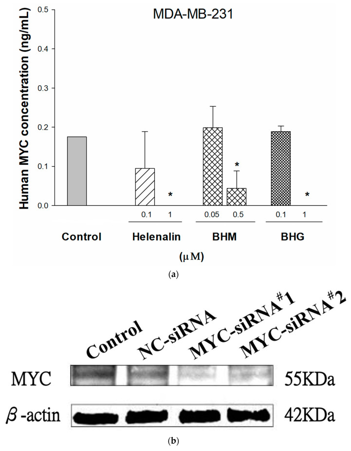 The effects of helenalin, (helenalinyl)malonate (BHM), and bis(helenalinyl)glutarate (BHG) on cell proliferation of MDA-MB-231 through MYC-dependent pathway. (