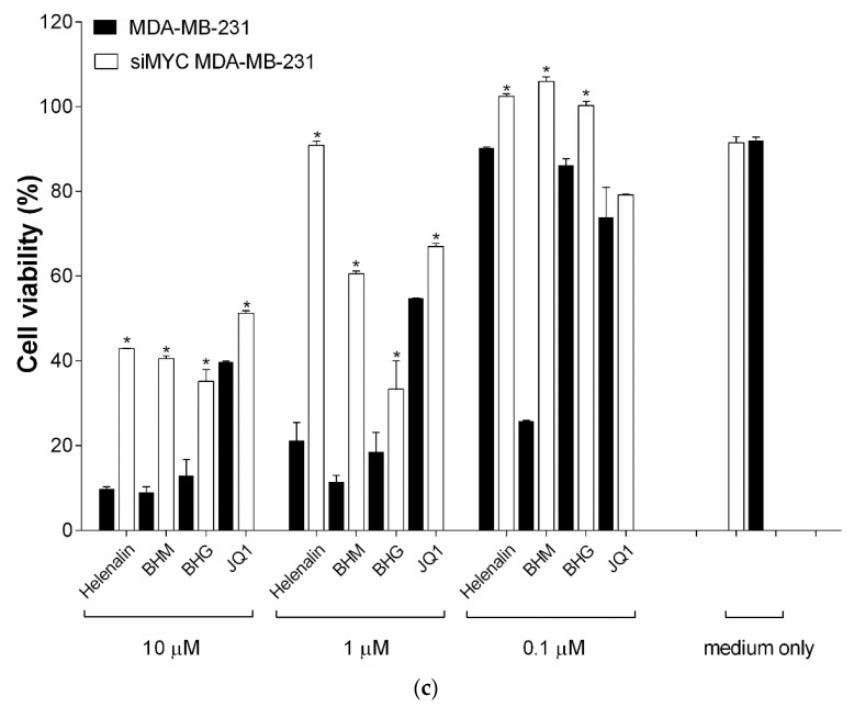 The effects of helenalin, (helenalinyl)malonate (BHM), and bis(helenalinyl)glutarate (BHG) on cell proliferation of MDA-MB-231 through MYC-dependent pathway. (a) MYC expression under helenalin, BHM, and BHG 72 h treatments in MDA-MB-231 cells was determined by enzyme-linked immunosorbent assay (ELISA). (b) Relative MYC levels in MDA-MB-231 cells transfected with scrambled siRNA (negative control) or MYC siRNA by western blotting. The uncropped blots are shown in the Supplemental Materials. (c) The cytotoxic effect of helenalin, BHM, and BHG in MDA-MB-231 cells with or without MYC siRNA transfection. Cytotoxicity was detected after a 72-h treatment. JQ1 was used as a positive control of MYC inhibitor. Statistical differences were evaluated by Student’s t-test. * denoted p < 0.05 as compared to untreated control in (b) and as compared to MDA-MB-231 cell line in (c). Data presented as mean ± standard error of at least two experiments, each in duplicate.