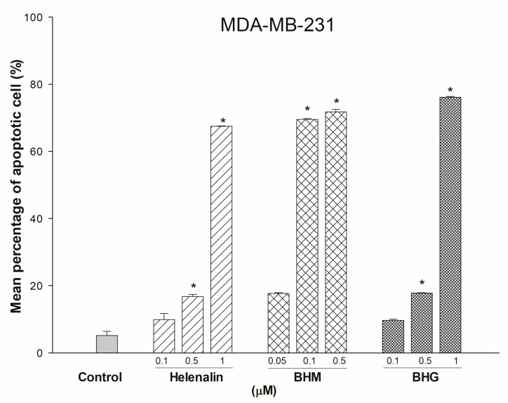 The effects of BHM, and BHG on MDA-MB-231 cells apoptosis. All three test compounds increased apoptotic cells in MDA-MB-231. * represented