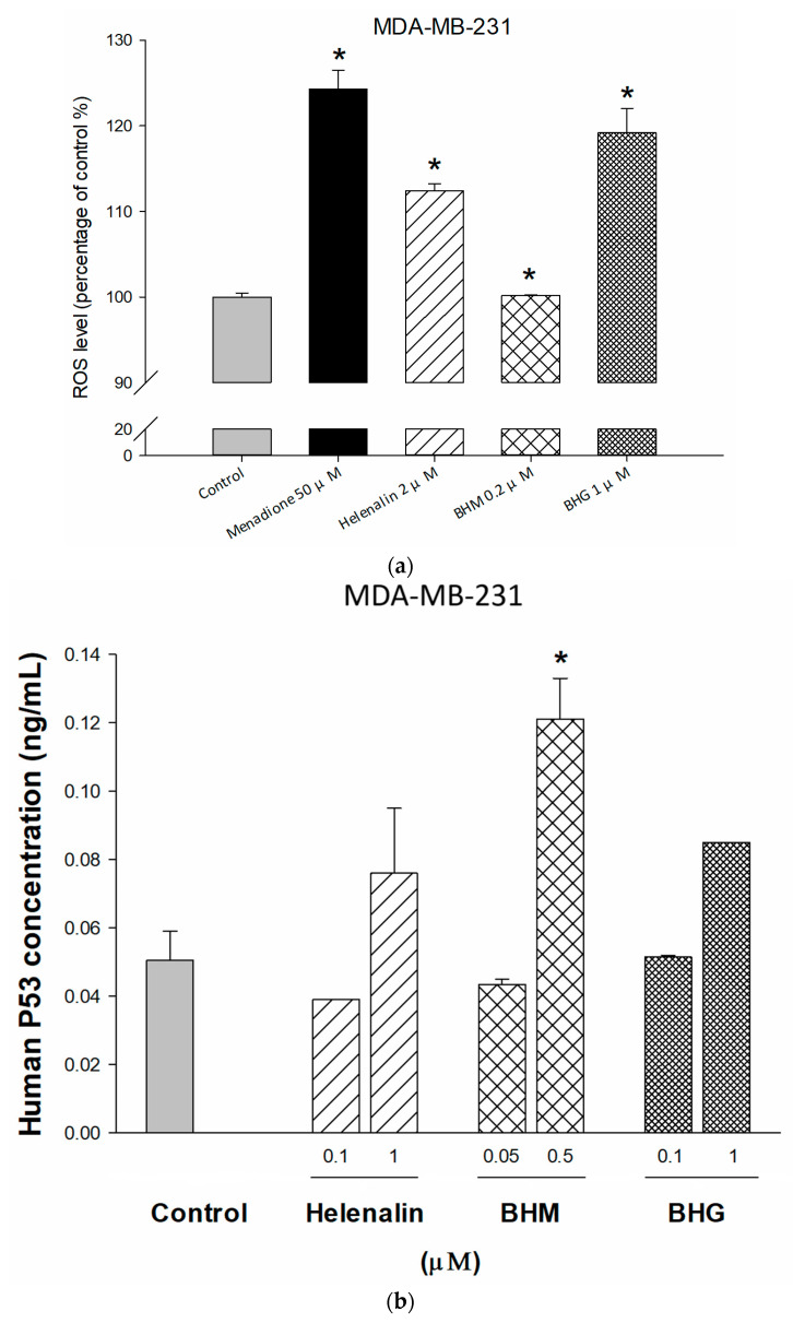 The underlying mechanism of apoptosis and G2/M arrest was determined by ROS assay and ELISA. The apoptotic cell-induced effects of helenalin, BHM, and BHG were detected by increasing ROS levels (