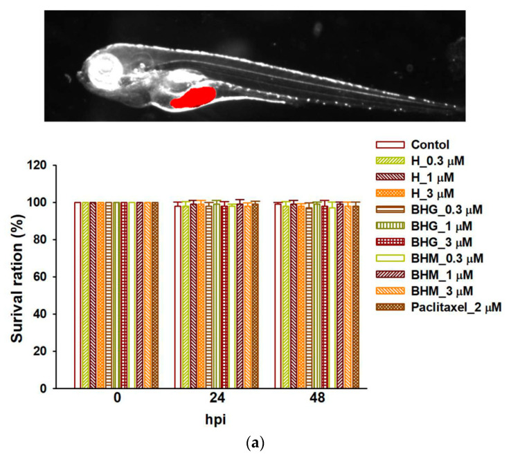 Helenalin, BHM, and BHG suppressed TNBC tumor growth in the xenotransplantation model. (a) The intensity of fluorescence was proportional to tumor size. There was no observable toxicity at 48 hpi after each compound treatment. P denoted as paclitaxel (positive control). (b) The MDA-MB-231 xenotransplantation model was treated in the presence and absence of test compounds, and helenalin, BHM, and BHG significantly inhibited tumor growth after 48 h of treatment. # p < 0.05 compared with the control; * p < 0.05 compared with control cells treated with test compounds. hpi: hours post-treatment or post-injection.