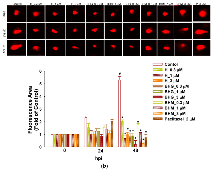 Helenalin, BHM, and BHG suppressed TNBC tumor growth in the xenotransplantation model. (a) The intensity of fluorescence was proportional to tumor size. There was no observable toxicity at 48 hpi after each compound treatment. P denoted as paclitaxel (positive control). (b) The MDA-MB-231 xenotransplantation model was treated in the presence and absence of test compounds, and helenalin, BHM, and BHG significantly inhibited tumor growth after 48 h of treatment. # p < 0.05 compared with the control; * p < 0.05 compared with control cells treated with test compounds. hpi: hours post-treatment or post-injection.