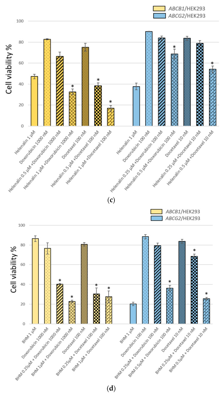 Inhibition abilities and chemosensitizing effects of helenalin, BHM, and BHG on ABC transporters in ABCB1 or ABCG2 overexpressing cells. (a,b) The intracellular calcein and hoechst33342 fluorescence were increased under helenalin, BHM, or BHG 30 min treatments in ABCB1/HEK293 cells and ABCG2/HEK293 cells. (ce) The synergistic cytotoxicity of helenalin, BHM, or BHG co-treated with docetaxel and doxorubicin indicated that helenalin, BHM, or BHG increased sensitivity to the chemotherapeutics docetaxel and doxorubicin in ABCB1/HEK293 cells and ABCG2/HEK293 cells. (fg) The MDR preventive effects of helenalin, BHM, and BHG in MDA/doc cells. Synergy assessment of helenalin, BHM, and BHG in combination with doxorubicin or docetaxel in ABCB1/HEK293 (h) and ABCG2/HEK293 (i) cell lines. Synergy scores were interpreted as follows: <−10, antagonism; −10 to 10, additive effect; >10, synergism. Statistical differences were evaluated by the ANOVA followed by post hoc analysis (Tukey’s test). * denotes p < 0.05 as compared to doxorubicin or docetaxel alone treatments. Each data is expressed as the mean ± standard error of at least two experiments, each performed in duplicate.