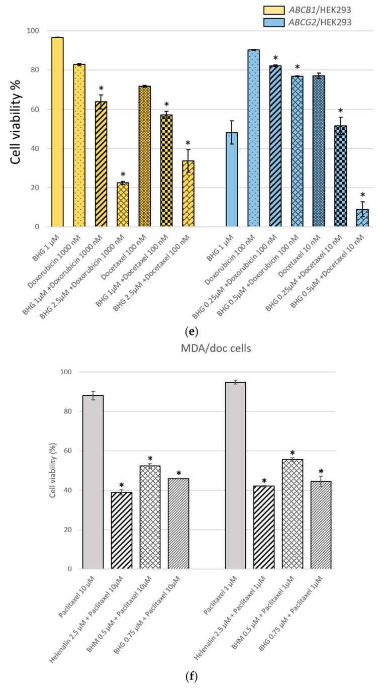 Inhibition abilities and chemosensitizing effects of helenalin, BHM, and BHG on ABC transporters in ABCB1 or ABCG2 overexpressing cells. (a,b) The intracellular calcein and hoechst33342 fluorescence were increased under helenalin, BHM, or BHG 30 min treatments in ABCB1/HEK293 cells and ABCG2/HEK293 cells. (ce) The synergistic cytotoxicity of helenalin, BHM, or BHG co-treated with docetaxel and doxorubicin indicated that helenalin, BHM, or BHG increased sensitivity to the chemotherapeutics docetaxel and doxorubicin in ABCB1/HEK293 cells and ABCG2/HEK293 cells. (fg) The MDR preventive effects of helenalin, BHM, and BHG in MDA/doc cells. Synergy assessment of helenalin, BHM, and BHG in combination with doxorubicin or docetaxel in ABCB1/HEK293 (h) and ABCG2/HEK293 (i) cell lines. Synergy scores were interpreted as follows: <−10, antagonism; −10 to 10, additive effect; >10, synergism. Statistical differences were evaluated by the ANOVA followed by post hoc analysis (Tukey’s test). * denotes p < 0.05 as compared to doxorubicin or docetaxel alone treatments. Each data is expressed as the mean ± standard error of at least two experiments, each performed in duplicate.