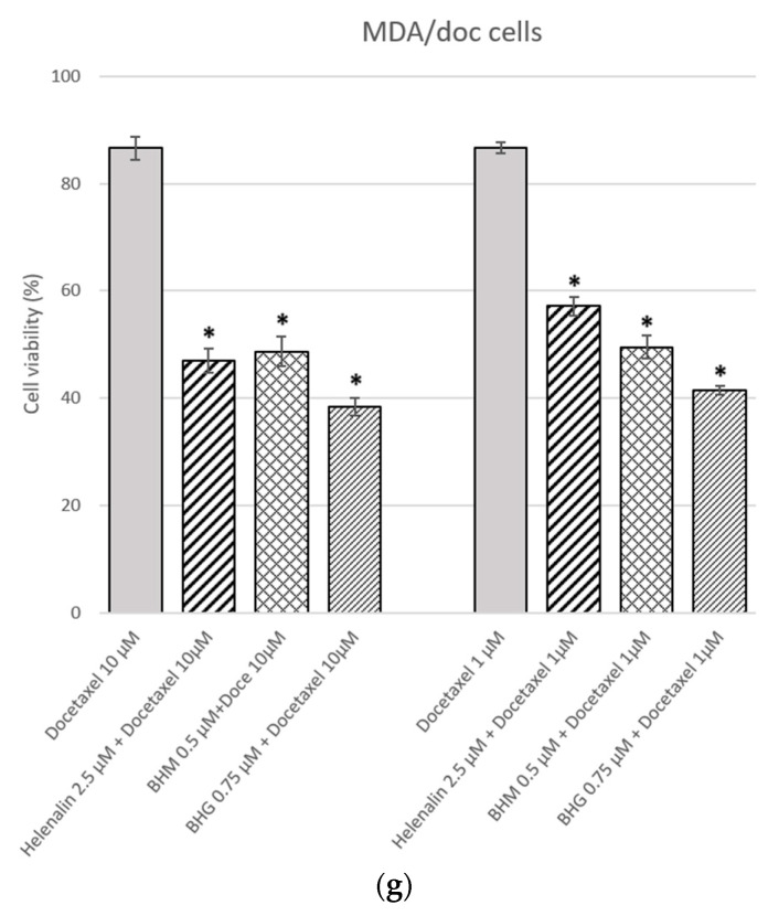 Inhibition abilities and chemosensitizing effects of helenalin, BHM, and BHG on ABC transporters in ABCB1 or ABCG2 overexpressing cells. (a,b) The intracellular calcein and hoechst33342 fluorescence were increased under helenalin, BHM, or BHG 30 min treatments in ABCB1/HEK293 cells and ABCG2/HEK293 cells. (ce) The synergistic cytotoxicity of helenalin, BHM, or BHG co-treated with docetaxel and doxorubicin indicated that helenalin, BHM, or BHG increased sensitivity to the chemotherapeutics docetaxel and doxorubicin in ABCB1/HEK293 cells and ABCG2/HEK293 cells. (fg) The MDR preventive effects of helenalin, BHM, and BHG in MDA/doc cells. Synergy assessment of helenalin, BHM, and BHG in combination with doxorubicin or docetaxel in ABCB1/HEK293 (h) and ABCG2/HEK293 (i) cell lines. Synergy scores were interpreted as follows: <−10, antagonism; −10 to 10, additive effect; >10, synergism. Statistical differences were evaluated by the ANOVA followed by post hoc analysis (Tukey’s test). * denotes p < 0.05 as compared to doxorubicin or docetaxel alone treatments. Each data is expressed as the mean ± standard error of at least two experiments, each performed in duplicate.