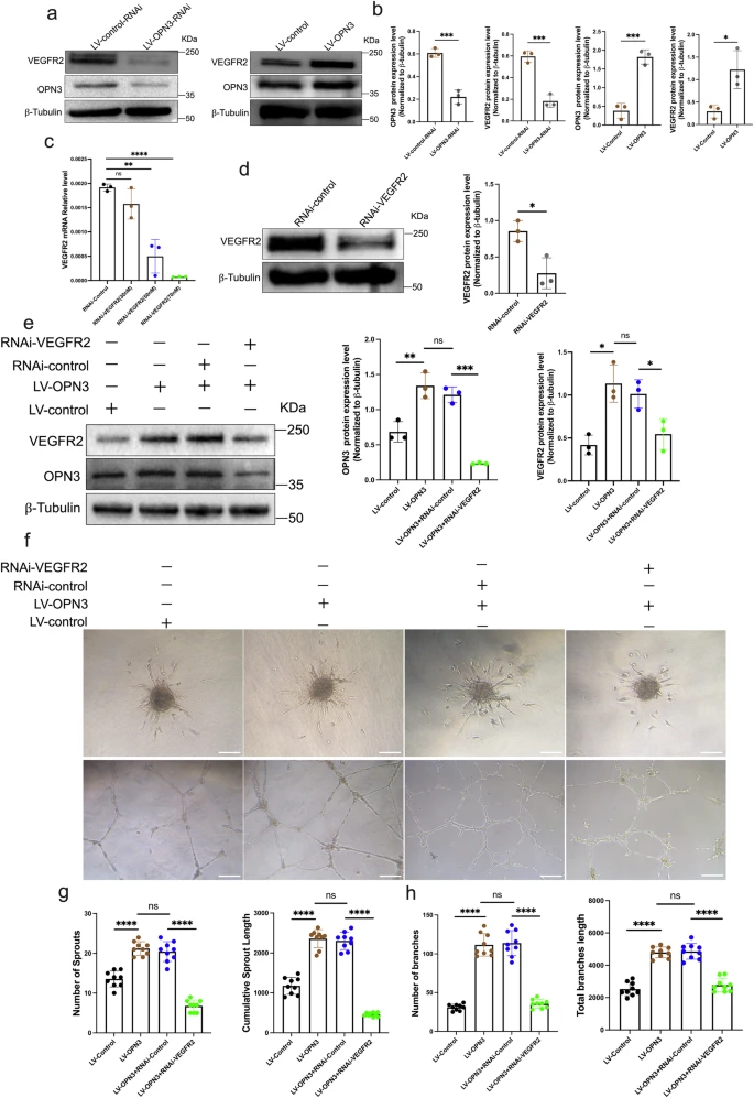 Fig. 4 OPN3-induced proangiogenic in HUVECs is mediated by promoting VEGFR2 expression.a, b Western blot analysis was used to detect the protein expression of OPN3 and VEGFR2 after lentiviral knockdown and overexpression of OPN3, using β-tubulin as a loading control for normalization in the WB analysis. Relative protein levels were quantified using ImageJ software (n = 3 independent experiments, with each experimental group consisting of 6 dishes, derived from 3 different donors, with each donor providing 2 dishes of cells). Statistical analysis was performed using an unpaired t-test: ns (not significant), *p < 0.05, ***p < 0.001. c SiRNA was used to silence VEGFR2 expression in HUVECs. The experiment was divided into a knockdown group (RNAi-VEGFR2) and a control group (RNAi-control). RT-qPCR was used to detect the mRNA expression levels of VEGFR2 under different siRNA concentrations (30 nM, 50 nM, 70 nM). The relative mRNA expression levels were calculated using the 2−ΔΔCt method, with GAPDH serving as the internal control (n = 3 independent experiments, with each experimental group consisting of 6 dishes, derived from 3 different donors, with each donor providing 2 dishes of cells). Statistical analysis was performed using an unpaired t-test: ns (not significant), **p < 0.01, ****p < 0.0001. d Western blot analysis was used to detect VEGFR2 protein expression under 50 nM siRNA treatment, using β-tubulin as a loading control for normalization in the WB analysis. Relative protein levels were quantified using ImageJ software (n = 3 independent experiments, with each experimental group consisting of 6 dishes, derived from 3 different donors, with each donor providing 2 dishes of cells). Statistical analysis was performed using an unpaired t-test: *p < 0.05. e Western blot analysis was used to detect OPN3 and VEGFR2 protein expression levels in different cell groups with overexpression of OPN3 or simultaneous overexpression of OPN3 and knockdown of VEGFR2, using β-tubulin as a loading control for normalization in the WB analysis. Relative protein levels were quantified using ImageJ software (n = 3 independent experiments, with each experimental group consisting of 6 dishes, derived from 3 different donors, with each donor providing 2 dishes of cells). Statistical analysis was performed using an unpaired t-test: ns (not significant), *p < 0.05, **p < 0.01, ***p < 0.001. f, h Cells from different experimental groups were seeded on Matrigel for 10 h to record and quantify tube formation. The number and length of branches were analyzed using ImageJ software to determine the extent of tube formation. f, g Spheroid sprouting experiments were conducted with cells from different experimental groups. The sprouts were recorded and quantified using optical microscopy, and the number and length of sprouts were analyzed using ImageJ software to evaluate the sprouting ability of HUVECs (n = 9 dishes of cultured HUVECs from 3 different donors, with each donor replicated three times). Statistical analysis was performed using an unpaired t-test: ns (not significant), ****p < 0.0001. The scale bar represents 100 μm. Data are presented as mean ± SEM.