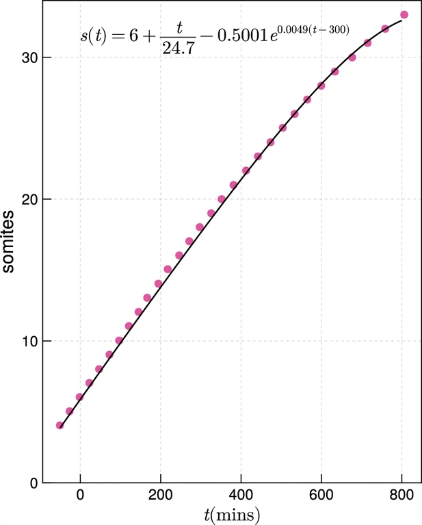 Fig. 5 - Supplemental 1 Zebrafish somitogenesis, after Schröter et al., 2008. Fitted function interpolating the data for zebrafish somitogenesis from Schröter et al., 2008 (black), against the raw data (magenta).