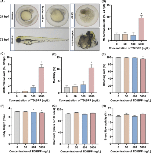 Fig. 1 Representative images of normal, malformed, and dead morphology of offspring zebrafish embryos at 24 and 72 hpf (A), malformation rate of offspring zebrafish embryos at 24 and 72 hpf (B, C), mortality (D), hatching rate (E), body length (F), heart rate (G), and blood flow activity (H) of offspring zebrafish embryos at 72 hpf, following maternal exposure to 0, 50, 500, or 5000 ng/L TDtBPP. n = 3. *p < 0.05 was considered to have a statistically significant difference.