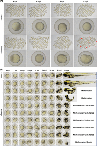 Fig. 2 Representative images of developing offspring zebrafish embryos at 4, 6, 8, and 9 hpf (A), and the morphological characteristics of normal (Control) and abnormal (5000 ng/L) epibolic embryos at different time points from 9 to 72 hpf (B), following maternal exposure to 0 or 5000 ng/L TDtBPP. Abnormal epiboly in embryos was indicated by red arrow.