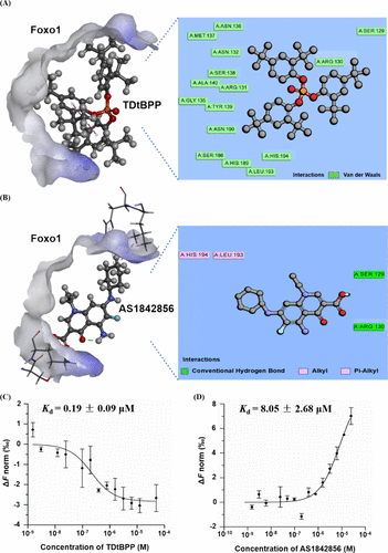 Fig. 5 Diagram of docking of zebrafish FoxO1 protein with TDtBPP (A) and AS1842856 (B). Concentration–response curves and measurements of Kd of TDtBPP (C) and AS1842856 (D) with FOXO1 protein interaction.