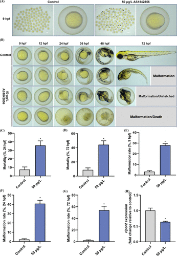Fig. 6 Representative images of developing zebrafish embryos at 9 hpf after exposure to 0 or 50 μg/L AS1842856 (A). Abnormal epiboly in embryos was indicated by black arrow. Morphological characteristics of normal (control) and abnormal (50 μg/L AS1842856) epibolic embryos at different time points from 9 to 72 hpf (B). Mortality of zebrafish embryos at 24 hpf (C) and 72 hpf (D), malformation rate of zebrafish embryos at 9 hpf (E), 24 hpf (F), and 72 hpf (G) after exposure to 0 or 50 μg/L AS1842856, n = 3. Expression of ripor2 in 9 hpf embryos following exposure to 0 or 50 μg/L AS1842856 (H, n = 6, two technical replicates for each experimental replicate). *p < 0.05 was considered to have a statistically significant difference.