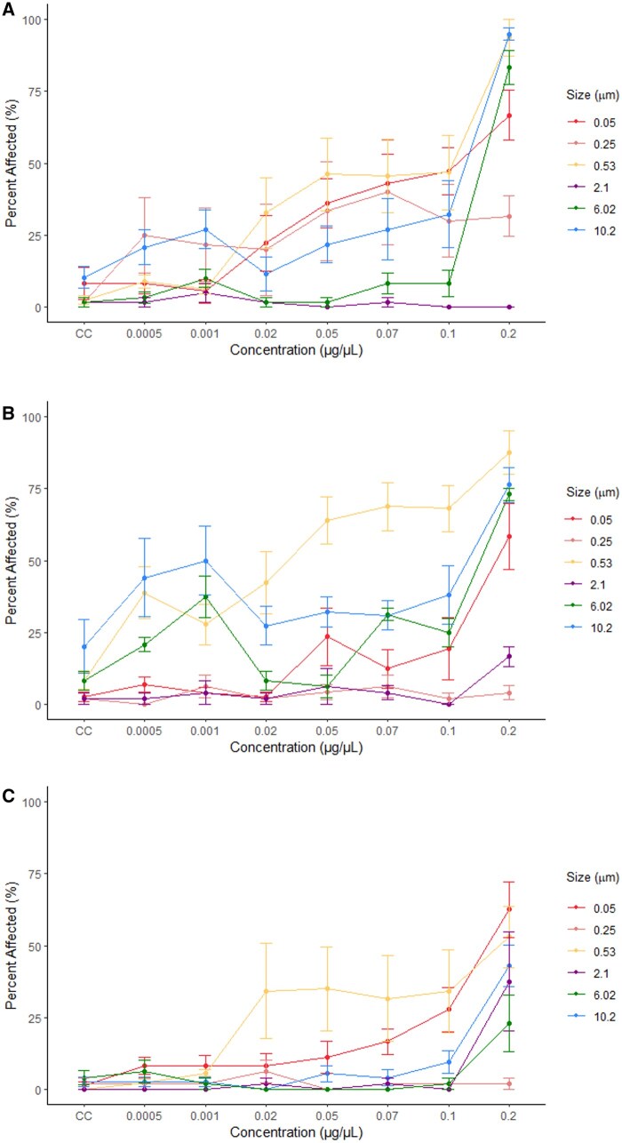 Mean percent and standard error of the mean of zebrafish larvae classified as affected following exposure to microplastics at seven exposure concentrations and a negative control (CC). Data are shown for larvae at 72 (A) (