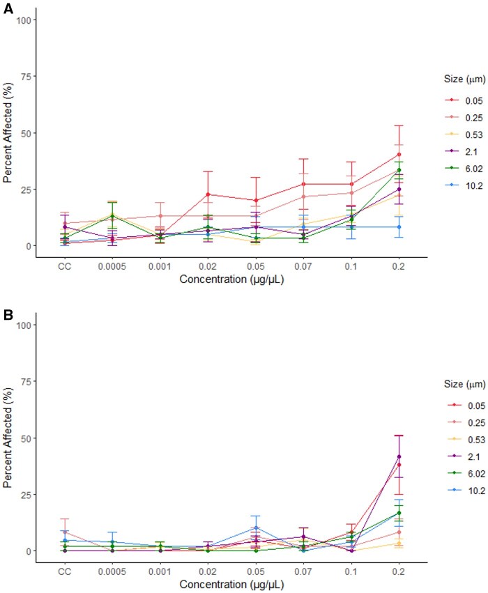 Mean percent and standard error of the mean of zebrafish larvae classified as affected following exposure to microplastics at seven exposure concentrations and a negative control (CC). Data are shown for larvae at 96 (A) (