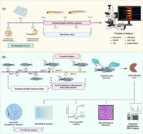 Fig. 1 Treatment and feeding regimen of zebrafish larvae and adults. (A) Larval zebrafish feeding and treatment regimen for short-term (5 days) and experimental techniques. (B) Adult zebrafish feeding and long-term experimental regime (6 weeks) and its experimental techniques; DCFDA—2′,7-dichlorodihydrofluorescein diacetate; DPPP—diphenyl-1-pyrenylphosphine; AO—acridine orange.