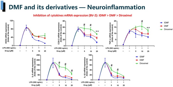 DMF and its derivatives inhibit the expression of iNOS, COX‐2, TNF‐α, IL‐1β and IL‐6 in LPS‐stimulated BV‐2 cells unequally, as determined by RT‐PCR. *